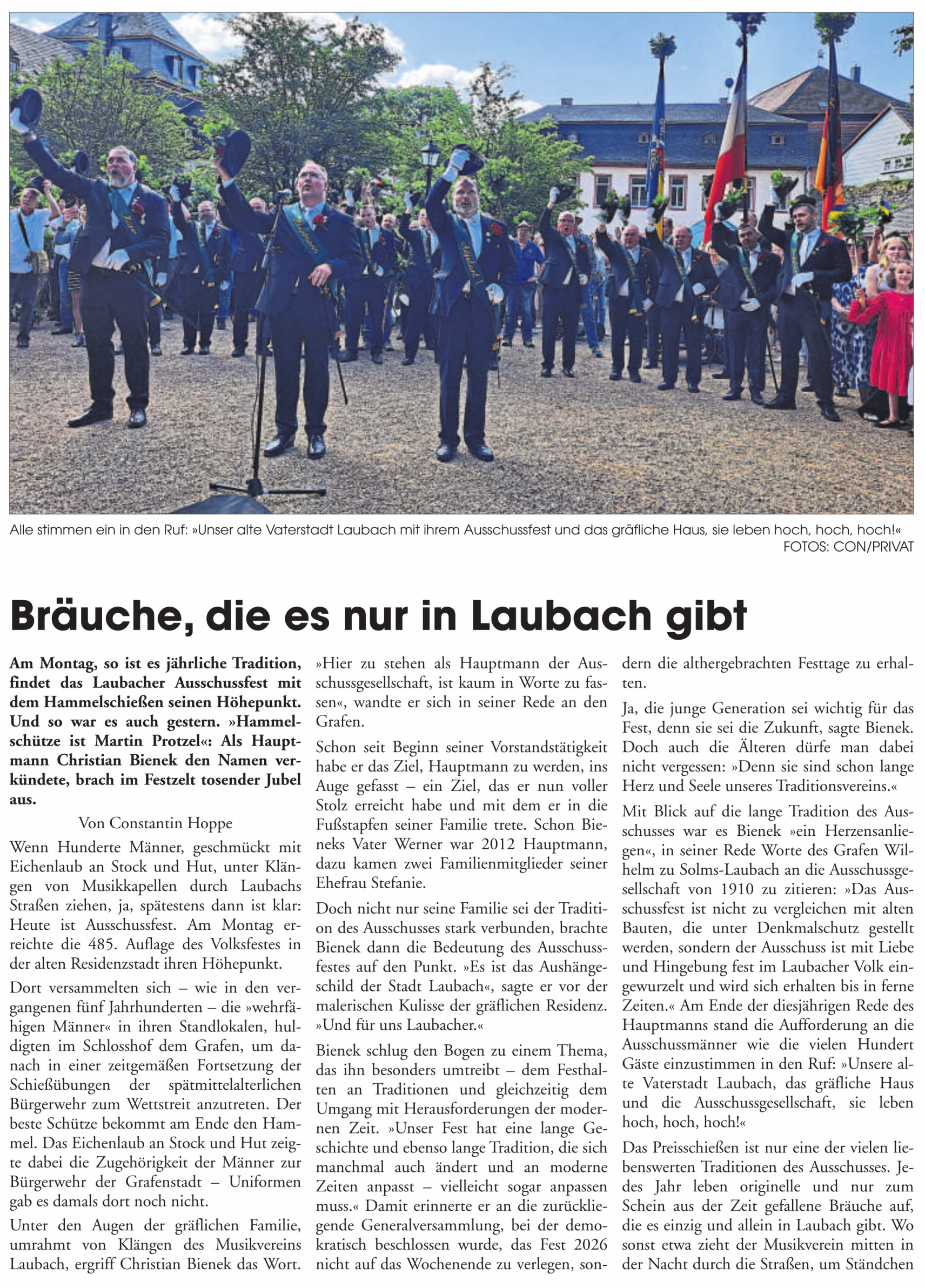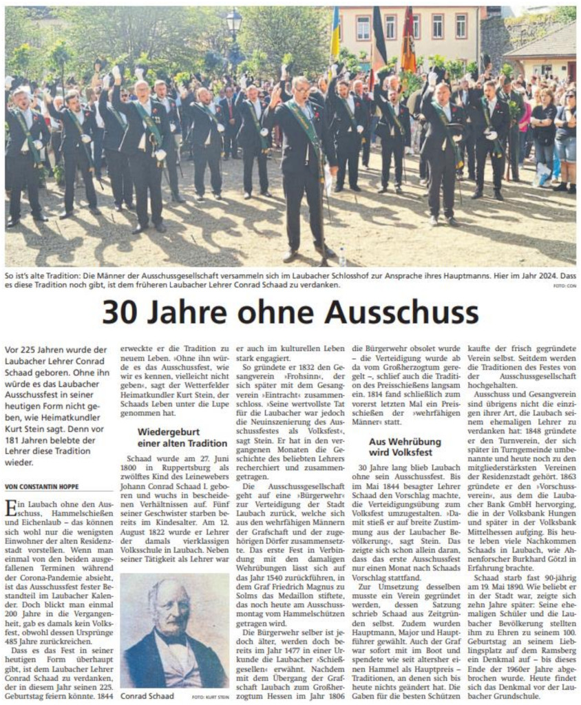 Vergangenen „Pfingst-Dienstag“ war es wieder soweit: Auswärtige und Besucher der Residenzstadt wunderten sich, Laubacher und Ausschußmänner gleichermaßen erfreuten sich an den dreifachen Hoch-Rufen, die durch die Innenstadt klangen.