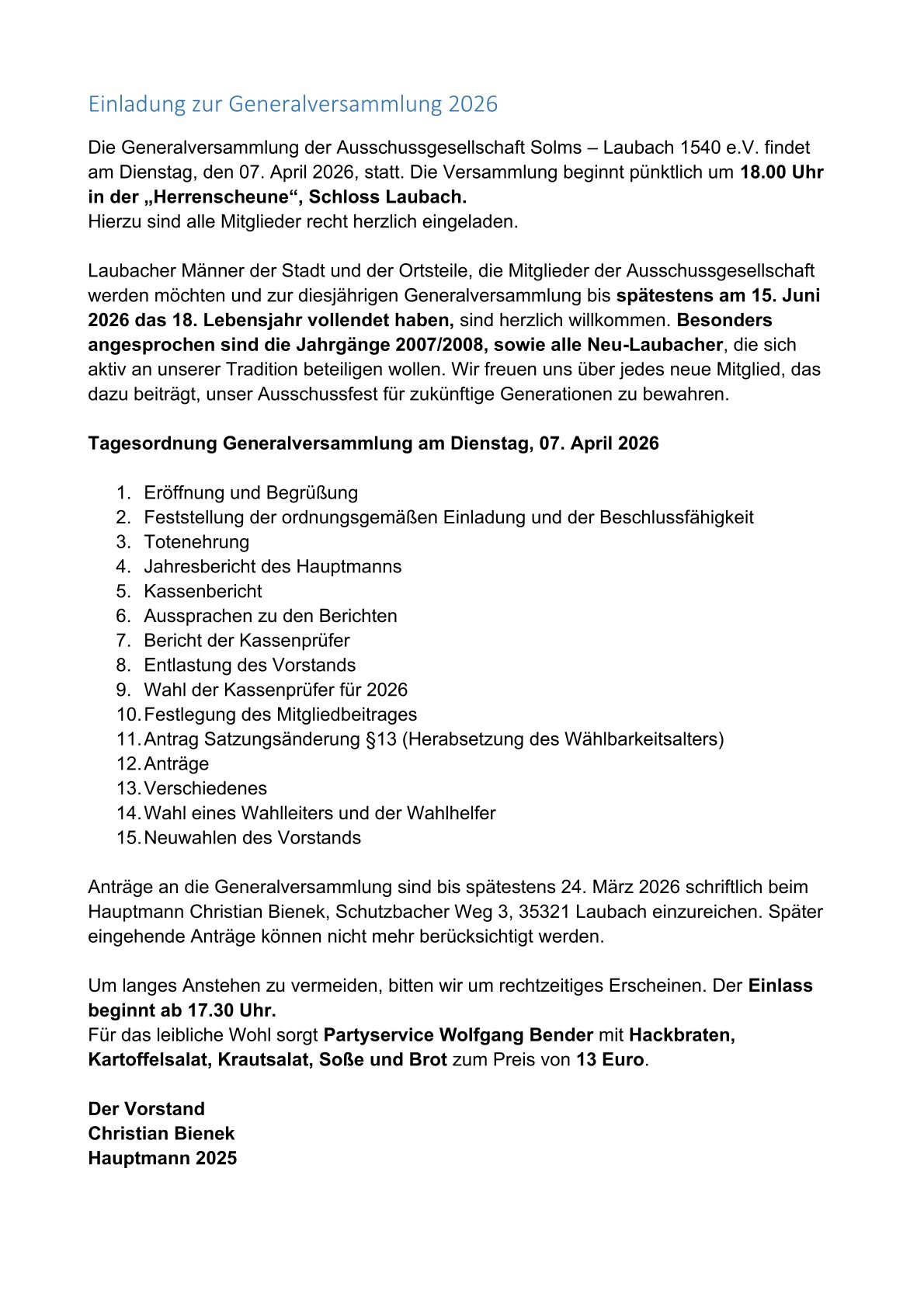 Überdurchschnittlich viele, nämlich 221 stimmberechtigte Mitglieder der Ausschußgesellschaft Solms-Laubach 1540 e.V. fanden sich zur Generalversammlung am traditionellen Termin zu „Oster-Dienstag“ in der Herrenscheune in unmittelbarer Nähe des gräflichen Schlosses ein. Nach langen und teils emotional und hitzig geführten Diskussionen, inklusive zum denkbar knapp abgelehnten Antrages zur Festverschiebung 2026, wählten die Anwesenden schließlich auch ihren neuen Hauptmann für das kommende Ausschußjahr. Gemäß altem Brauch schlug der scheidende Hauptmann Torsten Rinn seinen Nachfolger vor, den bisherigen Adjutanten Christian Bienek. Dieser wurde anschließend mit insgesamt 203 Stimmen bei der Wahl als neuer Hauptmann bestätigt. Torsten Rinn wurde seinerseits mit 195 Stimmen zum ersten Hauptführer gewählt und im Rahmen der ersten Vorstandssitzung, die noch in der Nacht in der guten Stube des frisch gebackenen Hauptmanns stattfand, traditionell zum Major befördert. Hauptmann Bienek ernannte abschließend den sehr erfahrenen Ausschußmann Rainer Thiel zu seinem ersten Adjutanten sowie Ulrich Münch zum Zweiten.