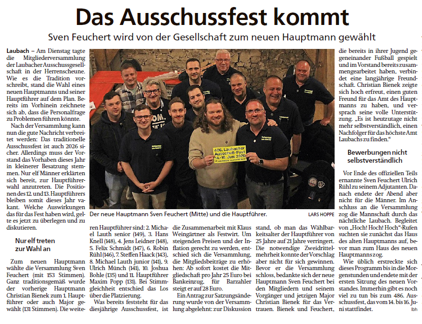 Insgesamt 161 stimmberechtigte Mitglieder der Ausschußgesellschaft Solms-Laubach 1540 e.V. fanden sich zur Generalversammlung am traditionellen Termin zu „Oster-Dienstag“ in der Herrenscheune in unmittelbarer Nähe des gräflichen Schlosses ein. Als Höhepunkt der Veranstaltung wählten die Anwesenden ihren neuen Hauptmann für das kommende Ausschußjahr. Gemäß altem Brauch schlug der scheidende Hauptmann 2025 Christian Bienek seinen Nachfolger vor, den bisherigen Pressewart Sven Feuchert. Dieser wurde anschließend mit insgesamt 153 Stimmen bei der Wahl als neuer Hauptmann bestätigt. Bienek wurde seinerseits mit 131 Stimmen zum ersten Hauptführer gewählt und im Rahmen der ersten Vorstandssitzung, die noch in der Nacht in der guten Stube des frisch gebackenen Hauptmanns stattfand, traditionell zum Major befördert. Hauptmann Feuchert ernannte abschließend den Heimkehrer in den Vorstand, Ulrich Rühl zu seinem ersten Adjutanten.